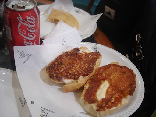 | Pão com requeijão, saltenha de frango com catupiry e a coca. | Bomba. Bomba. Chocolate. |